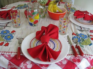 If I WAS going to buy new dishes they would REALLY have to speak to me "buy me! buy me!" They would have to be ones similar to these I saw on Brook Hollow Lane's Blog. Love the fruit glasses and how she uses everything on the table to their full, vintage, colorful potential.